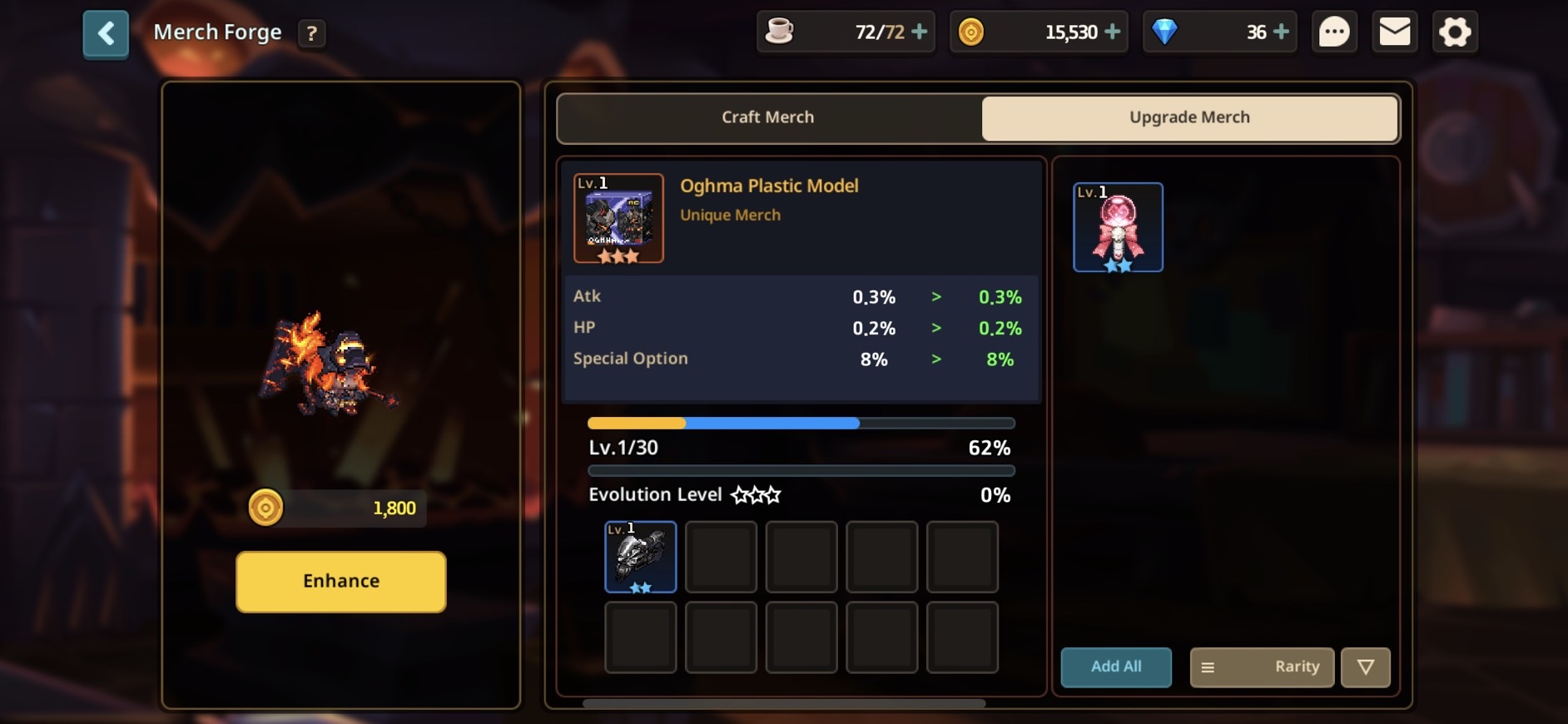 Increasing the Evolution Level of the merch will increase its grade (stars) and make the merch item’s special ability stronger.
